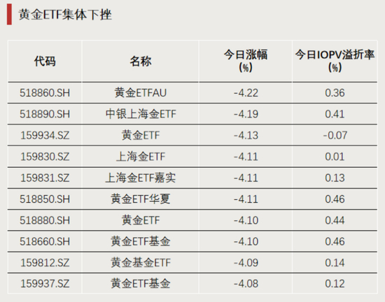 ETF方面,受国际金价下跌影响,黄金ETF再度集体下挫,跌幅榜前十均为黄金ETF。