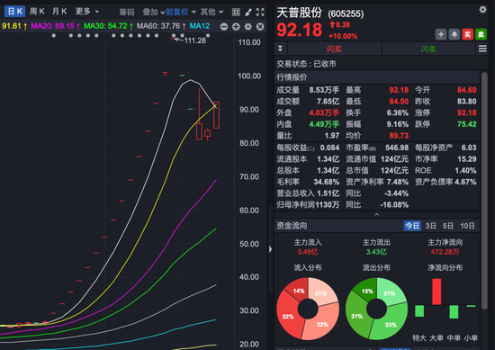 震荡回落数日后,天普股份(605255)股价10月22日再度收于涨停板,报92.18元/股。10月22日晚间,天普股份披露股票交易风险提示性公告。