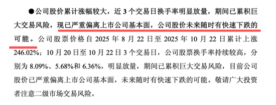同时,公司股票价格自8月22日至10月22日累计上涨246.02%;10月20日至10月22日3个交易日,公司股票换手率持续较高,分别为8.09%、5.68%和6.36%,明显放量,期间已累积巨大交易风险,目前公司股价已严重偏离上市公司基本面,未来随时有快速下跌的可能。
