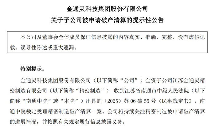 金通灵在10月22日晚的公告中称,精密制造被其债务方向法院申请了破产清算。原因是:2024年7月,神光公司与精密制造公司签订了《工矿产品合同》,约定由神光公司向精密制造提供加工镗铣床墩子服务。2024年8月,神光公司依约向精密制造公司送货,并开具了介货单、增值税专用发票。但精密制造仅于今年1月通过电子银行承兑汇票的方式支付了2万元,剩余款项并未支付。