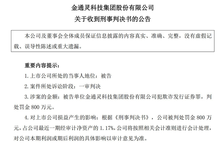 就在不久前的9月30日,金通灵宣布,公司收到上海市第三中级人民法院出具的《刑事判决书》,金通灵因犯欺诈发行证券罪,一审被判处罚金800万元;此外,金通灵时任董事长、前实际控制人季伟因犯违规披露重要信息罪和欺诈发行证券罪,决定执行有期徒刑六年,并处罚金300万元;袁学礼、许坤明等其他五名相关责任人也被分别判处有期徒刑及罚金。