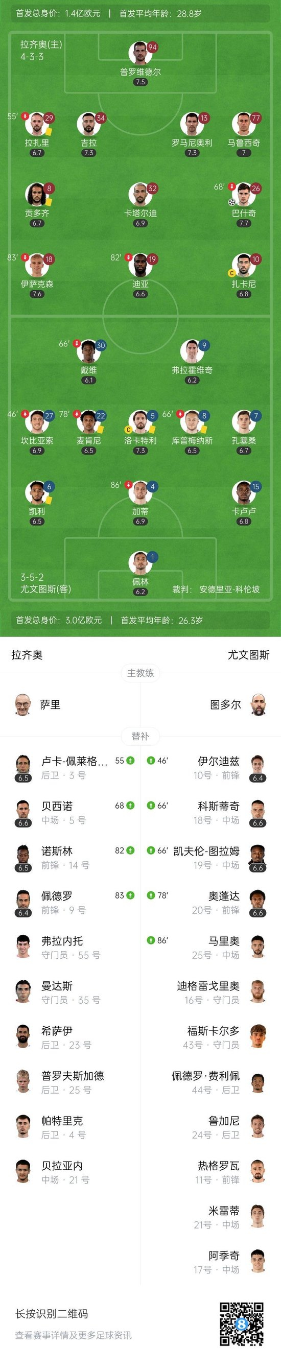 第9分钟,佩林门球开出,戴维头球回做,拉齐奥前场断球,卡塔尔迪做球,巴什奇带一步直接远射,皮球击中加蒂变线入网,拉齐奥1-0领先↓