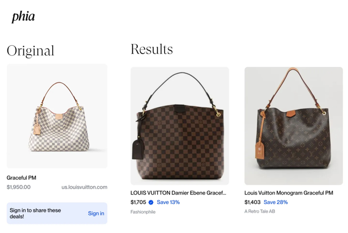 Phia 表示,其数据库已与 The RealReal、Vestiaire Collective、ThredUp、StockX、eBay、Poshmark 等顶级转售平台接入,覆盖超过 2.5 亿件商品。