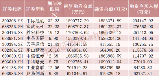 从个股情况来看,上周融资客对113只股票加仓金额超1亿元,加仓金额居前的10只股票分别为中际旭创、寒武纪-U、胜宏科技、中芯国际、天孚通信、东山精密、中信证券、中科曙光、工业富联、兆易创新,分别净买入29.41亿元、27.66亿元、25.15亿元、14.16亿元、13.03亿元、11.57亿元、11.47亿元、7.20亿元、6.43亿元、6.37亿元。从市场表现上看,上周融资客加仓金额居前十的股票全线上涨,涨幅最大的中际旭创涨逾32%。
