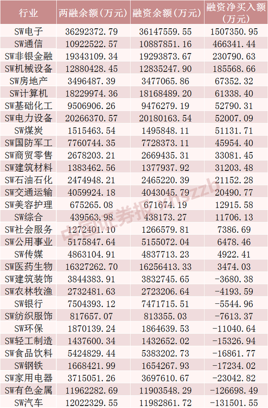 从行业情况来看,上周申万一级31个行业中有20个行业融资余额增加,电子、通信、非银金融行业融资净买入金额居前,分别为150.74亿元、46.63亿元、23.08亿元。融资余额减少的11个行业中,汽车、有色金属、家用电器行业融资净卖出金额居前,分别为13.15亿元、12.67亿元、2.30亿元。