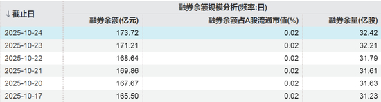Wind数据显示,截至10月24日,A股市场融券余额为173.72亿元,上周融券余额增加8.22亿元,融券余量为32.42亿股。