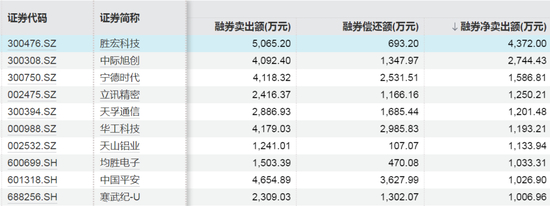 上周融券净卖出额居前的股票为胜宏科技、中际旭创、宁德时代,净卖出金额分别为4372万元、2744.43万元、1586.81万元。