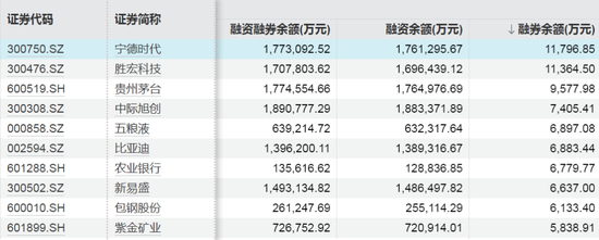Wind数据显示,截至10月24日,A股市场融券余额居前的股票分别为宁德时代、胜宏科技、贵州茅台,融券余额分别为1.18亿元、1.14亿元、0.96亿元。